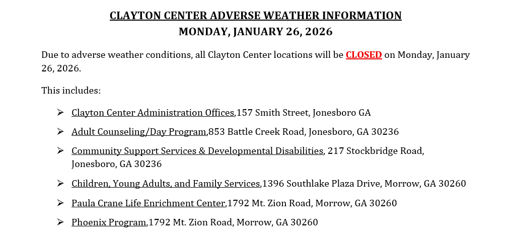 The Clayton Center Community Service Board provides services that minimize the impact of mental illness, developmental disabilities and substance abuse in the lives of persons served and their families while supporting their inclusion in the community.